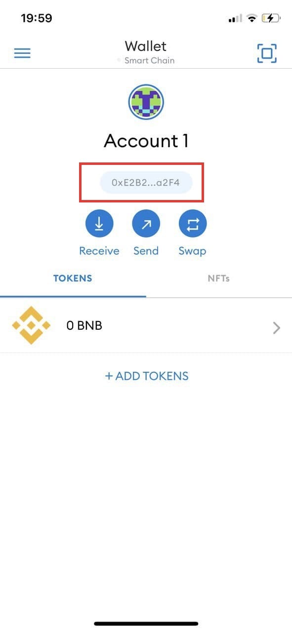 6) Congratulations! You’ve connected your MetaMask wallet to the Binance Smart Chain. To copy the public address of your wallet tap it. If you don't know how to get BNB (BEP-20) and BUSD (BEP-20), check our guide on how to buy crypto.