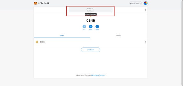 6) Congratulations! You’ve connected your MetaMask wallet to the Binance Smart Chain. To copy the public address of your wallet click on your account’s name. If you don't know how to get BNB (BEP-20) and BUSD (BEP-20), check our guide on how to buy crypto.